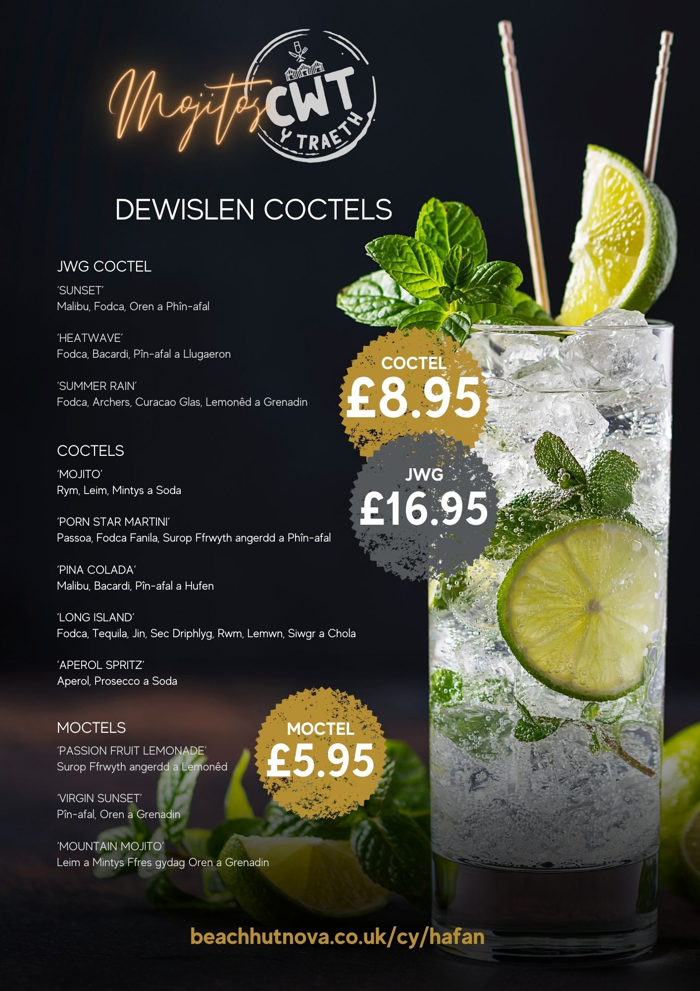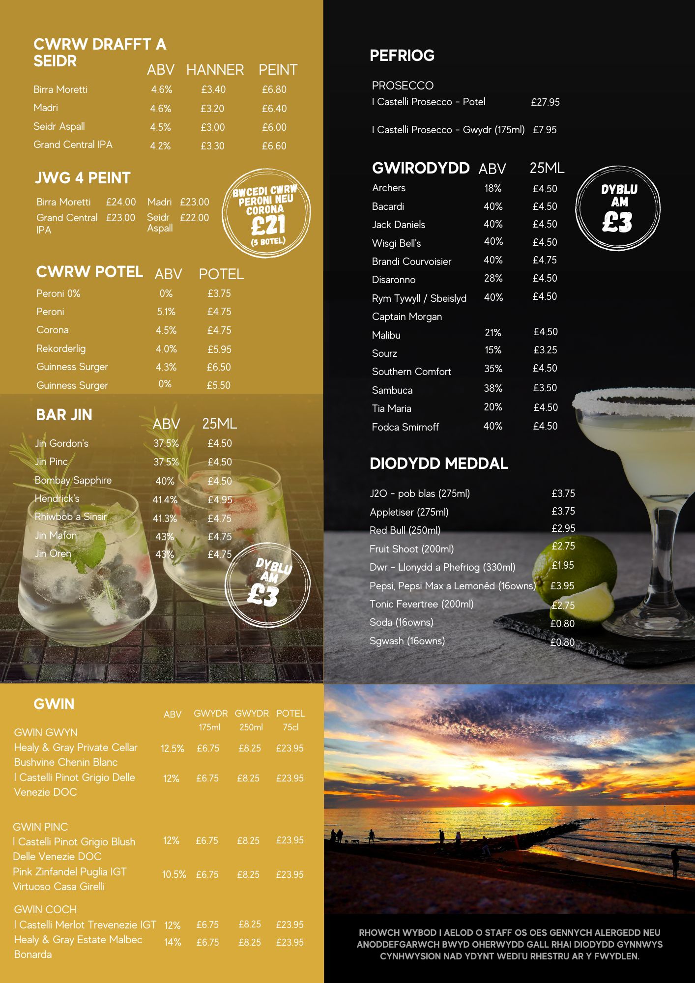 Dewch i fwynhau’r awyrgylch a dadflino wrth i chi fwynhau un o’n coctels bendigedig gyda golygfeydd panoramig o arfordir Gogledd Cymru.